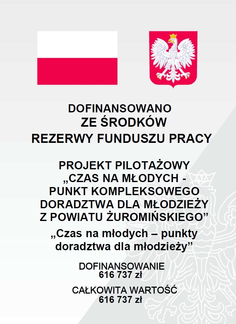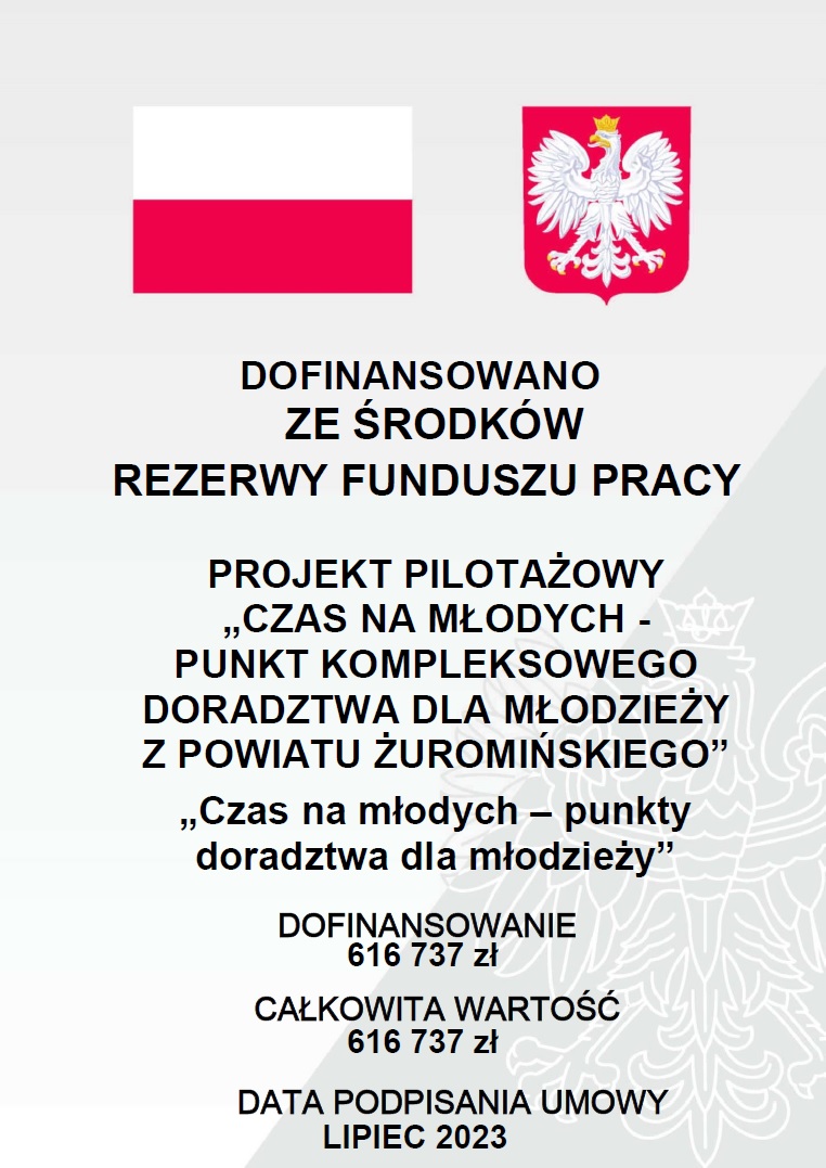 Projekt jest realizowany ze środków Rezerwy Funduszu Pracy, na podstawie ogłoszonego przez Ministra Rodziny i Polityki Społecznej w 2023r. naboru na projekty pilotażowe pod nazwą „Czas na Młodych – punkty doradztwa dla młodzieży"